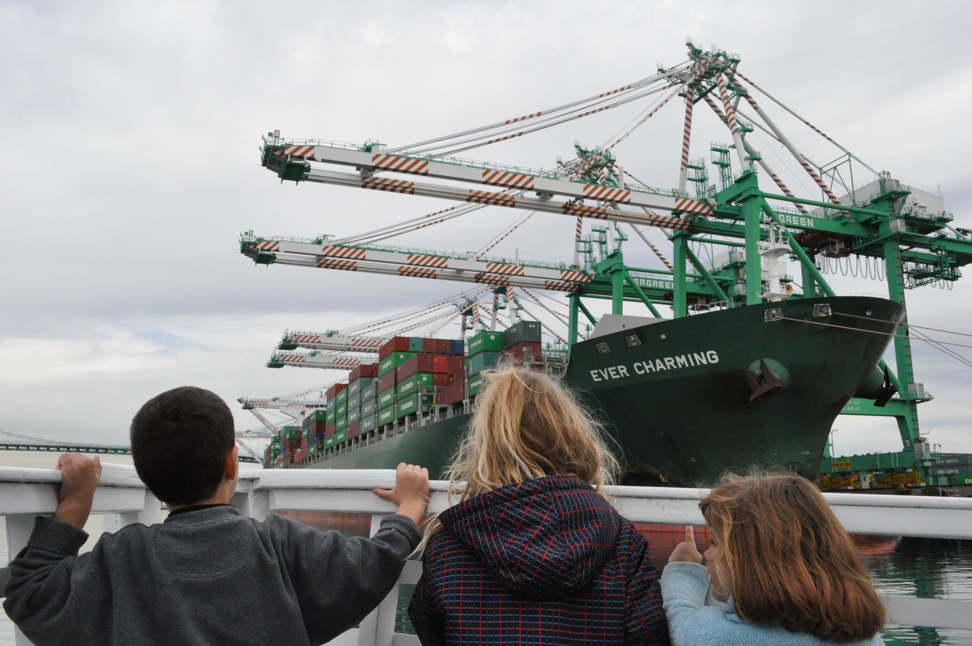 One of the many highlights was coming up alongside a H-U-G-E cargo ship. The kids and their friend from school were fascinated (as was I) watching the big, heavy duty cranes load cargo containers onto the “Ever Charming” ship from Germany.