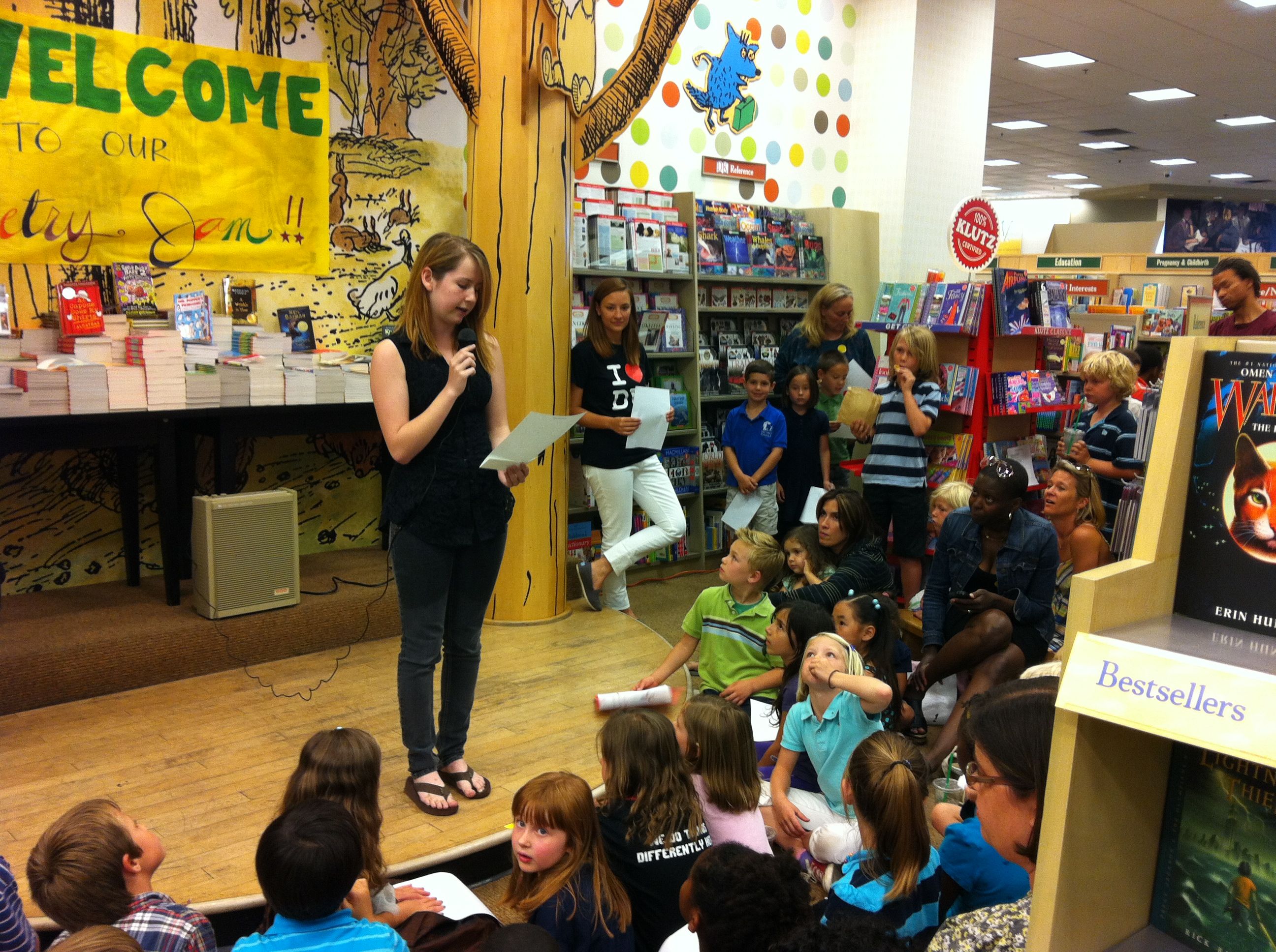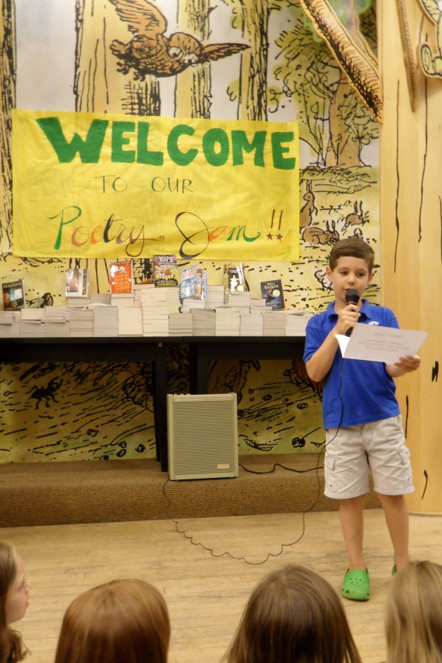 This afternoon there was a “Poetry Jam” that the teachers at Jacob’s school organized and held at our local Barnes & Noble Bookstore. Many, many students walked up to the mic with confidence and recited their poetry. If I think back to myself as a 6-year old, I don’t think I would have walked up so bravely and recited poetry in front of a large audience in a public location like that. I love how at DaVinci these students are learning the art of public speaking at such a young age. What a cool thing!