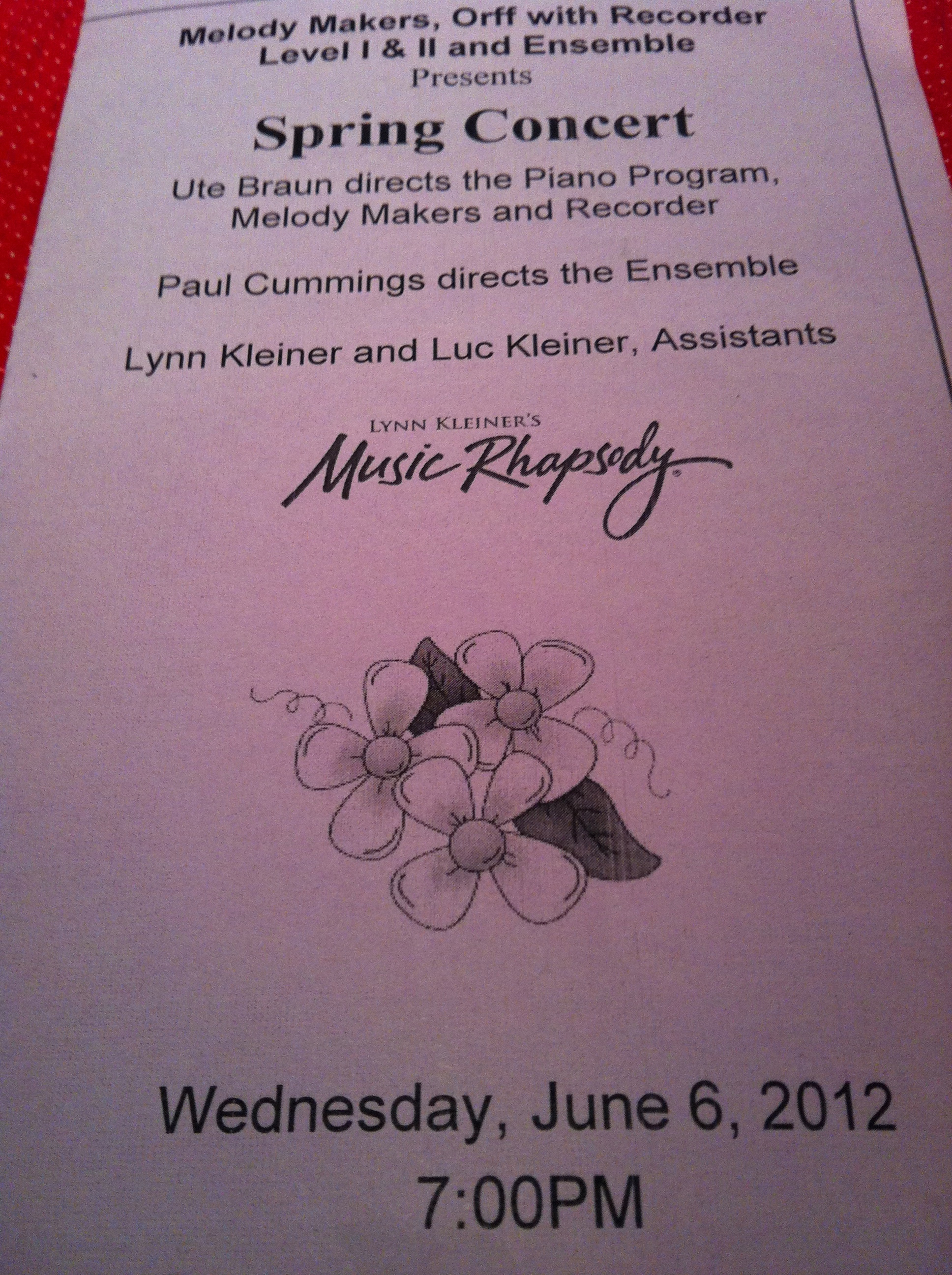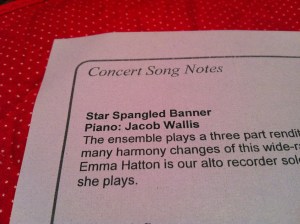 And then the night ended with a phenomenal music concert! The caliber of the music that Jacob and his peers can now play is simply amazing to me. I have to say my heart swelled SO full with pride when I opened the program and saw Jacob’s name in print for a solo in the opening piece. The recorders began playing their notes. Jacob sat at attention with his fingers in place on the keys of the piano. He waited for just the right moment to take the cue from the conductor. As he played his way through “Star Spangled Banner” and nailed all the left and right hand chord changes, my heart seriously swelled to a point of bursting. Tears came to my eyes. God has blessed Jacob with musical talent- that is a for sure! Thank you God. Thank you. I am SO thankful for his music teacher who has taught him so much. Music is going to be a significant part of Jacob’s life- I just have this hunch.