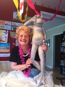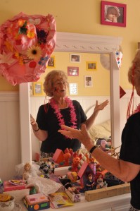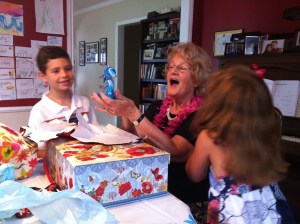 Lots of stories……lots of hilarious laughter as she opened up her presents! When Natalie had called her asking her what she would like for her birthday, my mom mentioned perhaps a new animal statue for her patio. Well ‘lo and behold she got a giant reclining frog statue and a bejeweled metallic blue peacock. It made her laugh soooooooooooo hard. But that’s what you get when you have a 4-year old go shopping with mama. Natalie loooooved getting to pick them out!!!!!