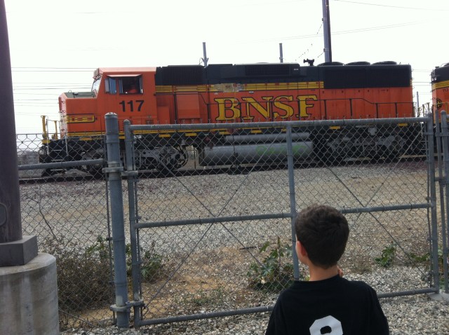I arrived just at the moment the 3 men were about to walk through the gate. “Hi!!!” I exclaimed. “We’d love to say hi! Do you have a moment?!” They kindly stopped. “So by any chance are one of you the engineer of the train?” Yup! But it was not the guy in the bright orange jumpsuit. He was one of the conductors. The engineer stretched out his hand and shook Jacob’s hand. That moment was priceless. Jacob was stoked beyond stoked. Words can’t even express the look that was on his face. So of course I had to ask what’s the difference between a conductor and an engineer. In my mind they were synonyms. No, not so much. The guys started bantering back and forth taking jabs at each other. The engineer saying you need to have more education to become the engineer. The conductor saying you need to have more physical strength to be the conductor. The engineer is the one who officially drives the train with one hand. The conductor uses both hands- pressing lots of buttons- to make the train do what it needs to do. The conductor is also the one who couples and uncouples the train cars. Little did I know that all trains have a 3-man crew: 1 engineer + 2 conductors. Except those trains that go across the country; they only have a 2-man crew: 1 engineer + 1 conductor. These guys haul the tanker cars to/from the refineries here in L.A. Fascinating stuff!!!